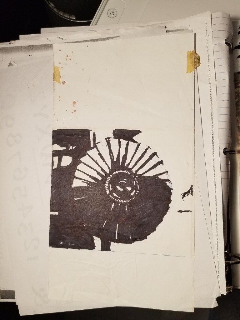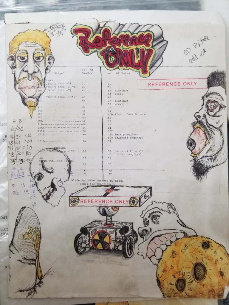 The engine shop was set up to disassemble jet engines that did not qualify for flight for one reason or another. The engines were taken apart, cleaned, inspected, repaired and reassembled to be tested for “serviceability” before being installed on an aircraft. My job initially was to sort through the tubes that carried fluids and air throughout the engine to make sure they were not damaged in a way that compromised the integrity of the line or engine function. I sorted through hundreds of tubes looking for tiny imperfections which would keep them from being used. The powers that be took notice that I was able to read, nterpret, and apply the engine manual and decided to keep me around to train me further. The people who worked in the inspection department were the jedi council of the shop; the brain of the operation. They took me in and began exposing me to more complex tasks and procedures allowing me to show what I was capable of learning. I doodled a lot during this period; I put any and all writing utensils available to me in that environment down onto any paper I had in front of me. Even on engine paperwork.