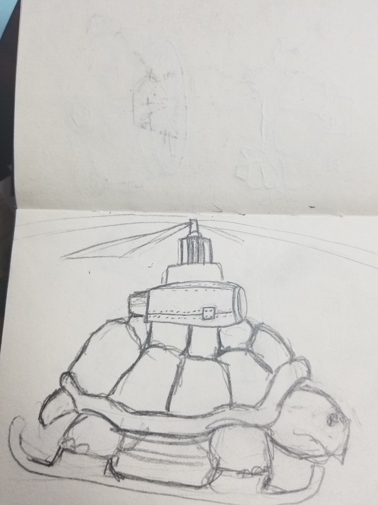 I still kept up with drawing in my sketchbooks, coming up with new ideas based on what I saw around me. I began developing and heavily revisiting the turtle idea and incorporating jet engines into it. Previous versions of the turtles I’ve made were simpler. The first was made in middle school and it had a smaller turtle on its back as a handle for the shell lid, the second one was made in high school and was not lidded. It had a giant cactus on it’s back and while it was a technically superior turtle, it still lacked substance. So the sketches that came from this time period revisited the turtle idea in a way that reflected what I was doing.